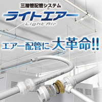 エアー配管に大革命!!新世代配管の三層管を採用し、鋼管配管に対し、軽量かつ省施工で、コストダウンも可能です。また、既設管からの変換も容易で曲げることができ、自由自在に配管が可能になります。