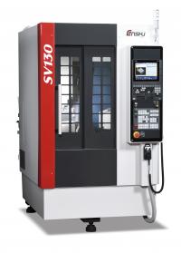 小径加工、精密加工向けの高精度立型15番マシニングセンタSV130。小型ながら広い加工エリアを持ち、30番からのダウンサイジングや多数個取りも可能。2APC、同時5軸仕様にも対応しています。
