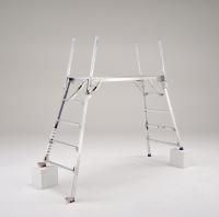 建設現場の地中梁や高速道路の中央分離や道路脇のフェンスなど障害物を乗り越えるための昇降具です。 天板があるので商品に対して正対した状態で安全に昇降できます。 脚の伸縮でレベルの調整も可能です。